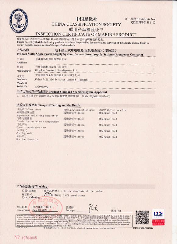 岸電設(shè)備通過了中國船級(jí)社認(rèn)證并獲得認(rèn)證證書,獲得國家電力電子產(chǎn)品質(zhì)量監(jiān)督檢驗(yàn)中心檢測證書。